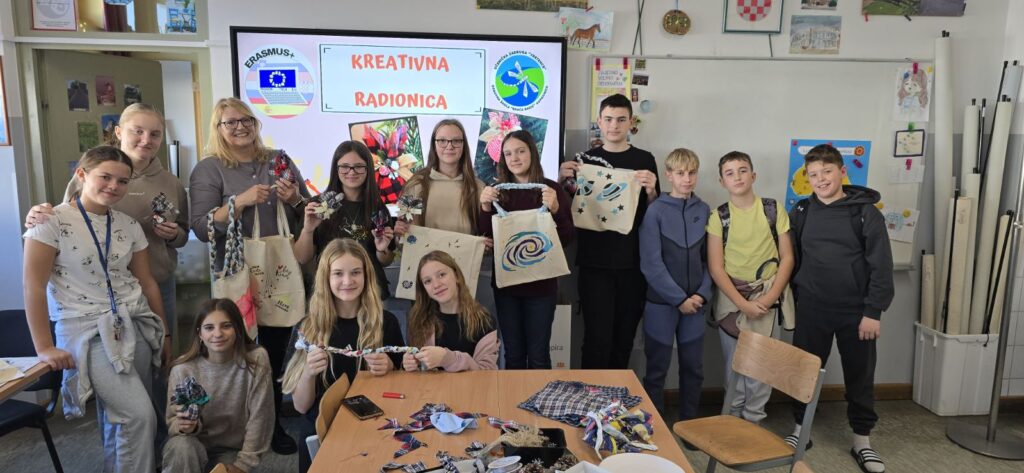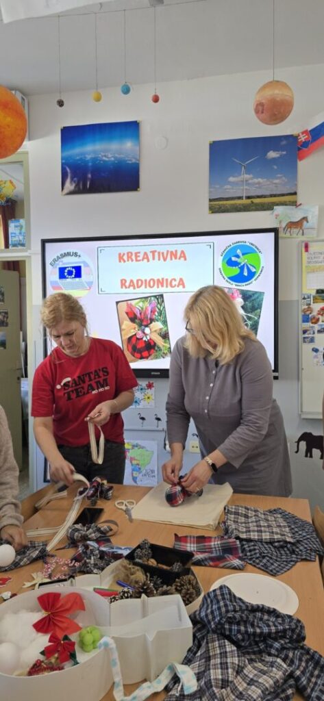 Ugostili smo učiteljice i učenike iz Slovenije u sklopu Erasmus+ projekta koji su sudjelovali u božićnoj radionici 12.12.2025. godine gdje su od reciklirane tkanine izrađivali božićne ukrase i platnene torbe.