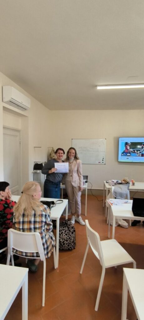 Tijekom tečaja sudionici su raspravljali o školskim programima održivog razvoja, sudjelovali u radionicama o zagađenju plastikom, analizirali utjecaj modne industrije na okoliš i ljudska prava te planirali učeničke projekte i ekološke politike unutar škola. Posebno su se istaknule motivirajuće i opuštene radionice predavačice Tamare Slovinske, kao i posjet edukativnom botaničkom vrtu u Firenci što je dodatno obogatilo iskustvo. Učiteljica je stekla nova znanja s naglaskom na podizanje ekološke svijesti među učenicima i razvijanje praktičnih načina kako škola može postati ekološki osvještenija i održivija.
