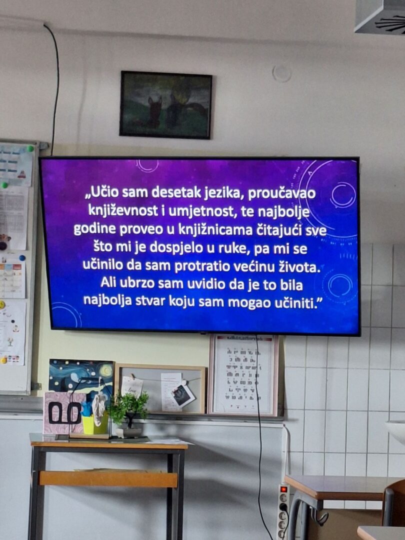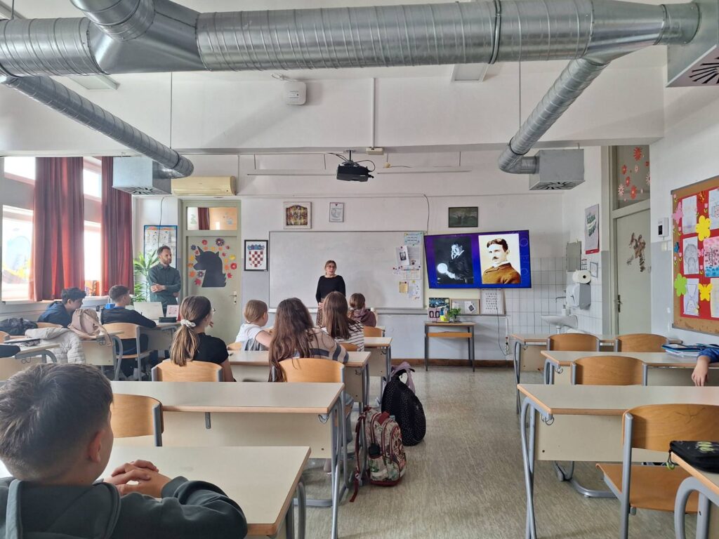 Nakon predavanja Izuzetne djevojčice u utorak, 21. travnja 2026., održano je predavanje na temu Veličanstveni mačak i izuzetan dječak Nikola Tesla s ciljem približavanja lika i djela jednog od najvećih znanstvenika svih vremena na način primjeren uzrastu učenika. Na samom početku su nas djelatnici Muzeja grada Koprivnice Marta i Marko uputili u događanja vezana uz manifestaciju Noć hrvatske knjige, a zatim smo čuli zanimljivu priču o Teslinom djetinjstvu te su učenici saznali kako je njegova radoznalost, upornost i maštovitost od najranije dobi bila temelj njegovih kasnijih velikih otkrića.