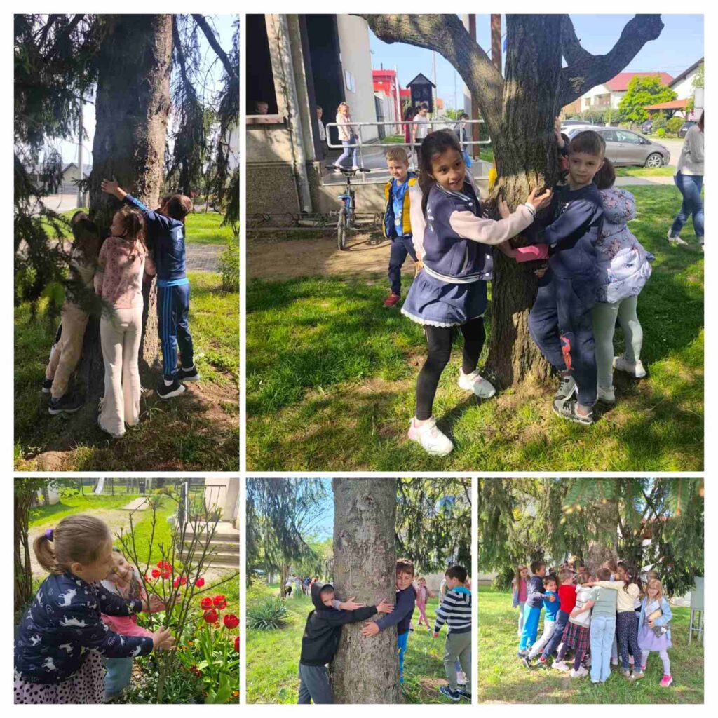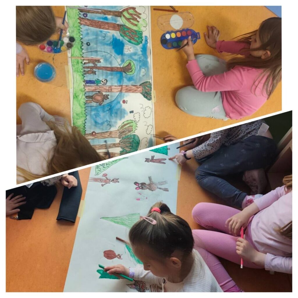Na kraju našeg susreta pročitali smo toplu priču Medo koji je volio grliti, nakon čega smo zagrlili stabla u školskom dvorištu i tako simbolično obilježili Dan planeta Zemlje. Inspirirani pričom, učenici su zatim crtali vlastite doživljaje i prikaze radnje – bez prethodnog uvida u ilustracije iz slikovnice. Bilo je posebno zanimljivo usporediti njihove originalne radove s ilustracijama iz knjige i vidjeti koliko je mašta svakog djeteta jedinstvena.