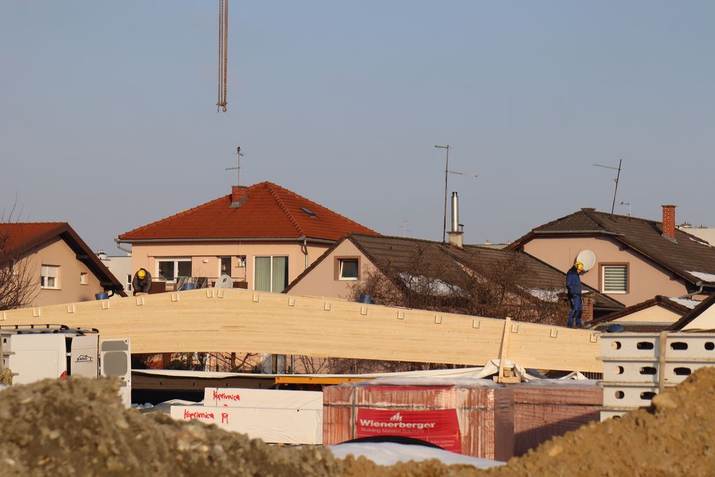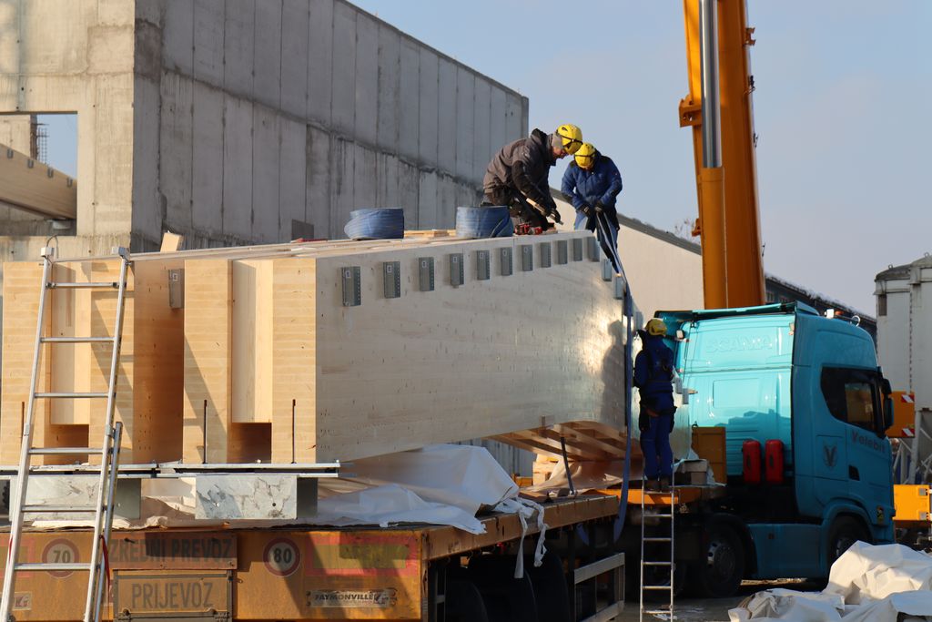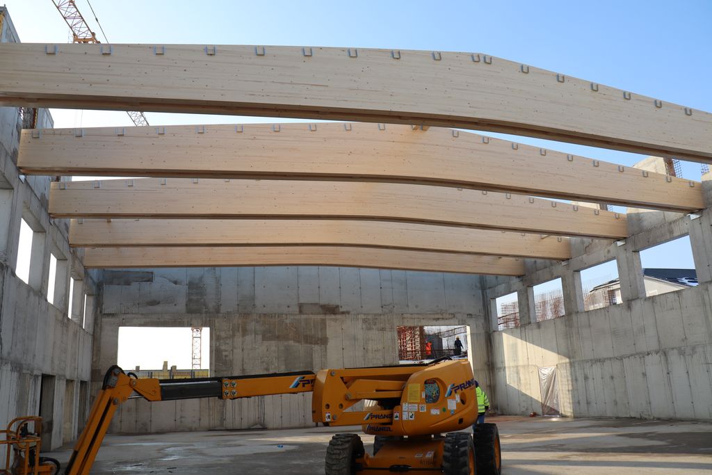 Krovna konstrukcija izvodi se od drvenih lameliranih nosača i greda te je projektirana kao suvremeni sendvič-sustav koji osigurava dobru toplinsku i zvučnu izolaciju prostora. Postavljanje velikih drvenih nosača već sada daje jasne obrise buduće dvorane i vidljivo mijenja izgled objekta.