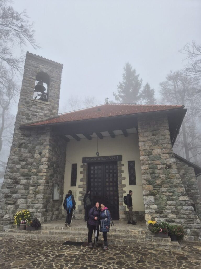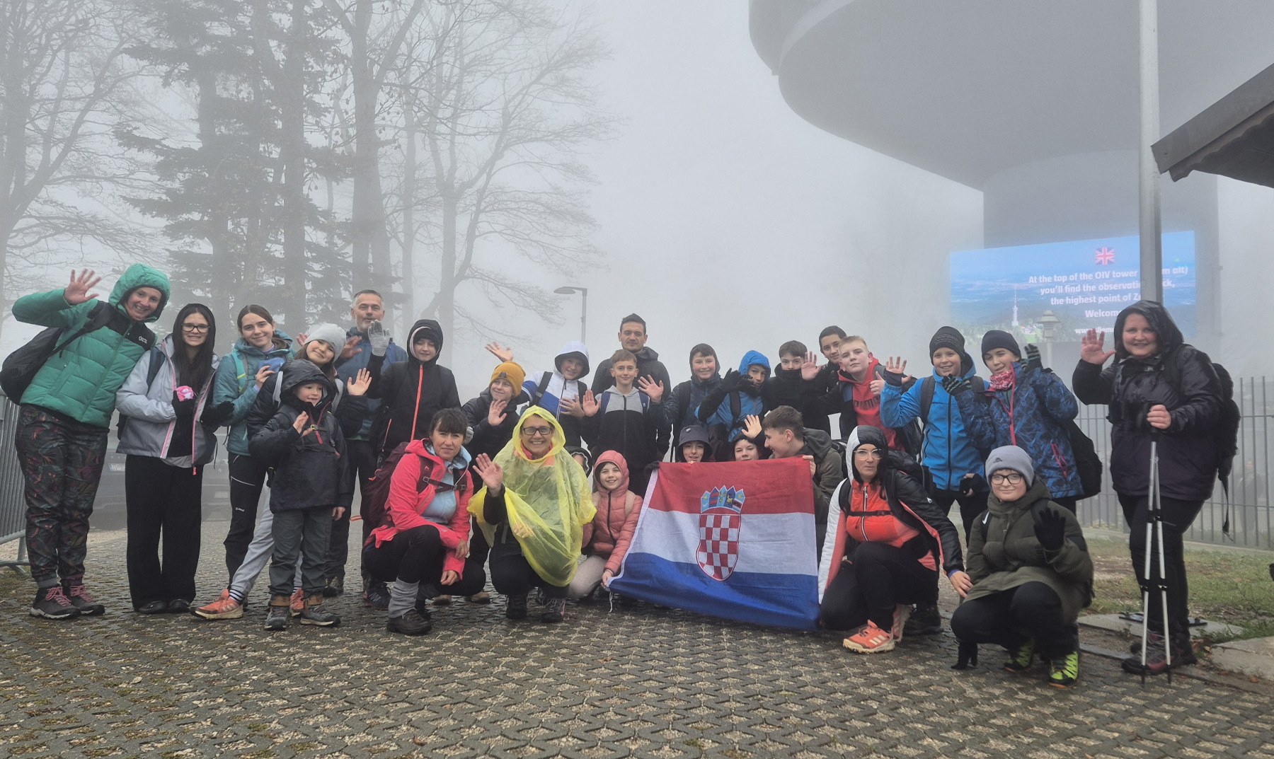 Uz put smo pogledali i karte planinarskih staza. Svakako najpoznatija slalomska utrka koje se odžava na Sljemenu je Snježna kraljica (Snow Queen Trophy). Još malo i kroz maglu nazire se Toranj Sljeme. Zbog magle i blage kišice zaustavili smo se pred tornjem i žičarom, kako bismo načinili zajedničku fotografiju.
