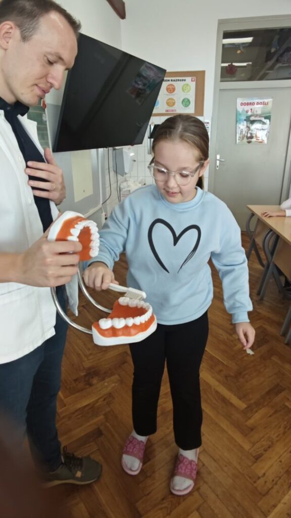 Nakon teorijskog dijela, učenici su praktično demonstrirali pravilno pranje i četkanje zubi na edukativnom modelu, čime su na zanimljiv i poučan način ponovili ono što su naučili.