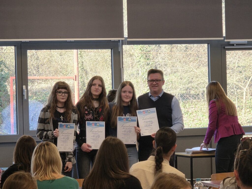 Učenice Maja Horvatić, Ena i Zana Čičin-Mašansker predstavile su se radijskom emisijom Školski bend – pričom satkanom od ritma, riječi i hrabrosti da se vlastiti glas podijeli s drugima. Njihove su rečenice tekle poput melodije, glatko i neusiljeno, a svaka je misao bila odsvirana s pažnjom i osjećajem. Kroz eter su poslale toplinu školskih hodnika, smijeh s proba i snagu zajedništva koje glazba stvara među mladima u našoj školi.