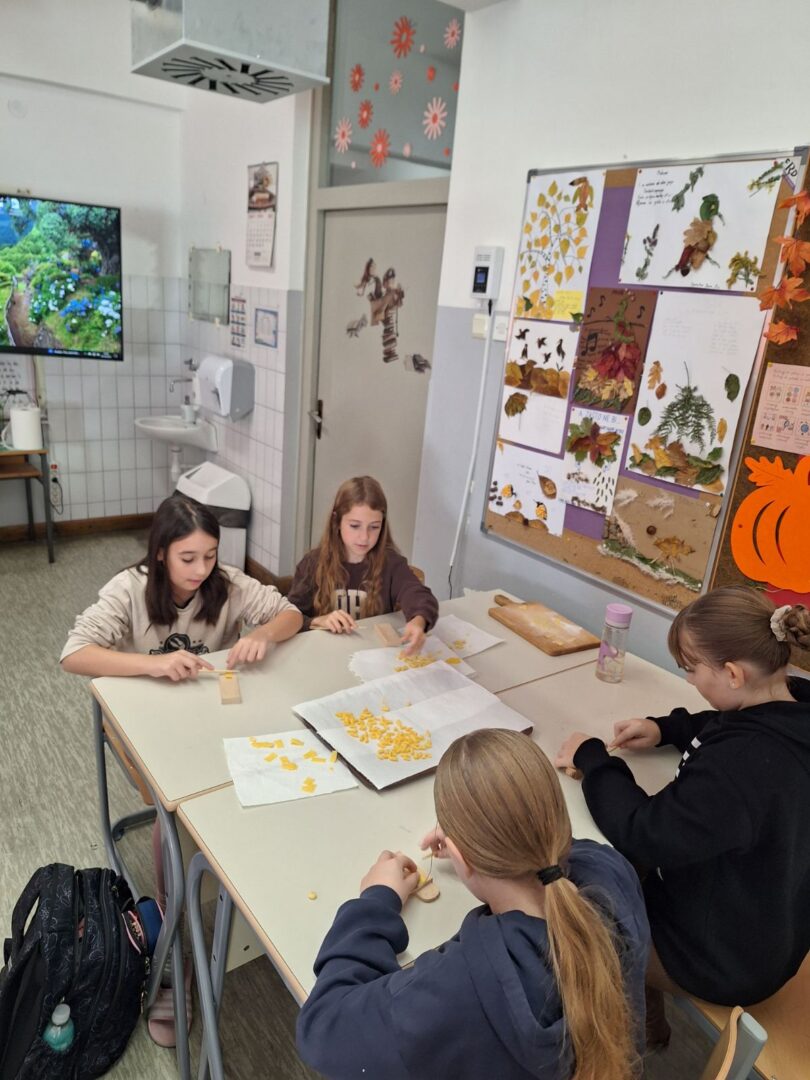 U četvrtak, 16. listopada 2025., učenici 5.e razreda su sa svojom razrednicom Ines Vađunec obilježili Dan kruha i zahvalnosti za plodove zemlje zanimljivom radionicom izrade tradicionalne tjestenine iz Đelekovca – požiraka.