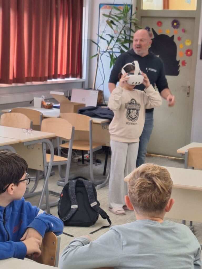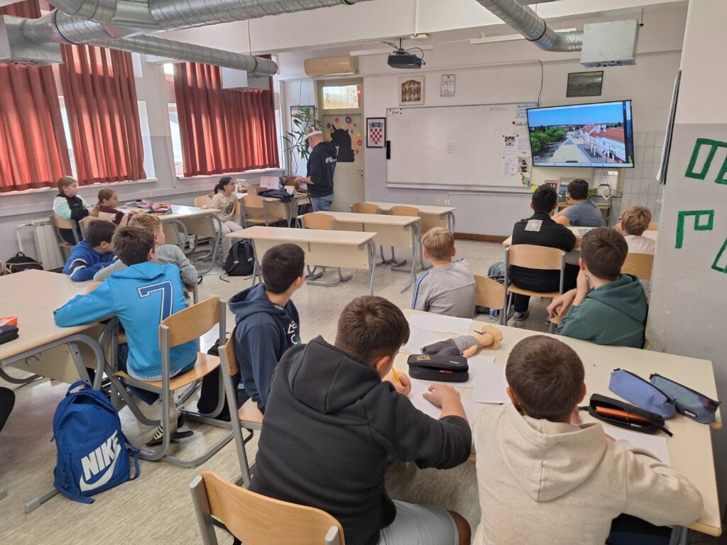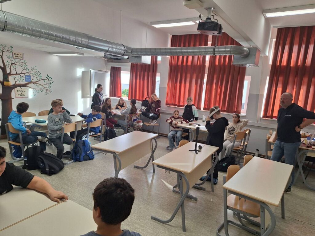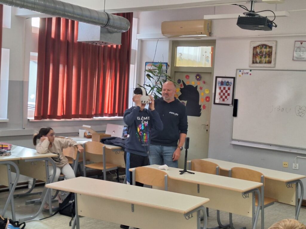U četvrtak, 30. listopada 2025., učenici 5.e razreda su sa svojom razrednicom Ines Vađunec ugostili gospodina Marija Kosa, Iskrinog tatu, koji je s njima odradio radionicu s VR naočalama. Uz pomoć virtualne stvarnosti (VR) učenici su imali priliku „prošetati“ ulicama našeg grada onako kako su izgledale prije te ih zatim usporediti s današnjim izgledom. Oduševljenje nije izostalo — mnogi su s iznenađenjem otkrivali kako su se poznata mjesta mijenjala kroz vrijeme. Prije našeg susreta gospodin Kos obišao je i našeg učenika Dominika Udovičića koji polazi nastavu kod kuće kako bi i on mogao isprobati VR naočale.